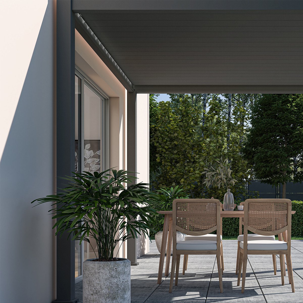 Conçue pour s’adapter aux conditions climatiques, la pergola bioclimatique Ombréa® VS 3x3M à lames doubles orientables prolonge votre saison extérieure.