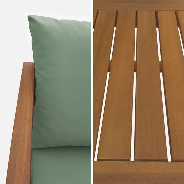 Salon de jardin en bois 4 places – Ushuaïa – Coussins vert de gris. canapé. fauteuils et table basse en acacia. design
